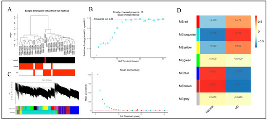 Analysis of WGCNA co-expression module based on GSE47908 gene chip. (A) Sample cluster analysis. (B) Analysis of the scale-free fit index and the mean connectivity for various soft-thresholding powers (β = 18). (C) Dendrogram of genes clustered based on the dissimilarity measure. (D) Heatmap of the correlation between different modules with UC.