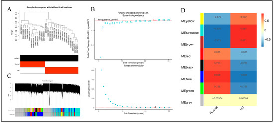 Analysis of WGCNA co-expression module based on GSE53306 gene chip. (A) Sample cluster analysis. (B) Analysis of the scale-free fit index and the mean connectivity for various soft-thresholding powers (β = 24). (C) Dendrogram of genes clustered based on the dissimilarity measure. (D) Heatmap of the correlation between different modules with UC.