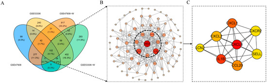 In this study, GSE47908, GSE53306 and validation dataset GSE38713 were retrieved and obtained from the GEO database (https://www.ncbi.nlm.nih.gov/ (accessed on 1 June 2021)). The GSE47908 contains 15 normal samples and 20 UC samples (normal samples: GSM1162227–GSM1162241; UC samples: GSM1162248–GSM1162267). The GSE53306 contains 12 normal samples and 16 UC samples (normal samples: GSM1289196–GSM1289207; UC samples: GSM1289168–GSM1289183). The validation set GSE38713 contains 13 normal samples and 15 UC samples (normal sample: GSM948550–GSM948562; UC sample: GSM948571–GSM948592). All samples are human colonic mucosal tissues, excluding samples treated with immunosuppressants, 5-aminosalicylic acid and samples with inactive UC. In Table 1, we listed all the information on the screened GSE datasets. The probe names were converted into Gene Symbols via the Bioconductor Affy package for the R language, and the expression data were normalized to each other based on the RMA algorithm. DEGs were screened using GEO2R with |Log2FoldChange| > 1 and p < 0.05.