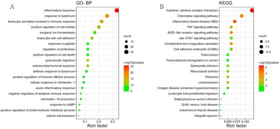 Enrichment analysis of core targets through GO and KEGG. (A) GO-BP pathway enrichment analysis. (B) KEGG pathway enrichment analysis.