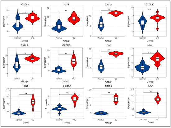 Top 12 hub gene expression in the GSE38713 ulcerative colitis dataset.Significance: **, p < 0.01.
