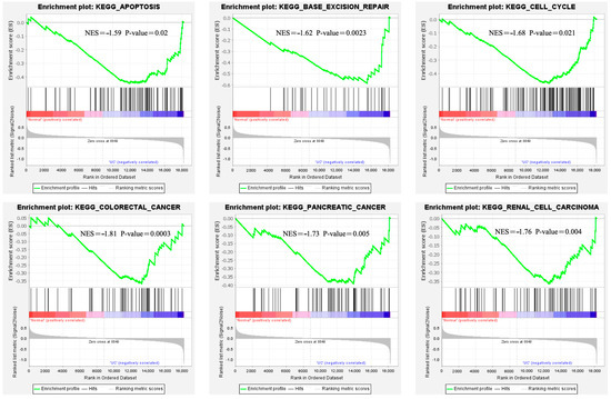 We normalized matrix data for GSE47908 and GSE55306. Expression profiles were obtained for 35 samples containing 20,549 genes and 28 samples containing 18,234 genes, respectively. The intersection of the two microarrays was obtained using the KEGG pathway gene set as a classification criterion, including the base excision repair pathway (NES = −1.62, p = 0.0023); cell cycle pathway (NES = −1.76, p = 0.004); colorectal cancer pathway (NES = −1.81, p = 0.0003); pancreatic cancer pathway (NES = −1.73, p = 0.005); apoptosis pathway (NES = −1.59, p = 0.02) (Figure 7).