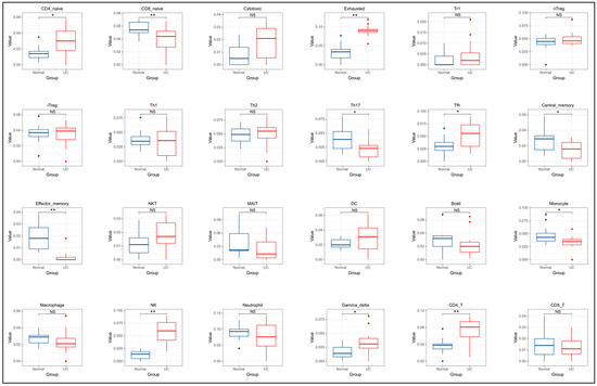 Immune cell infiltration in ulcerative colitis and control groups. Significance: NS, p > 0.05; *, p < 0.05; **, p < 0.01.