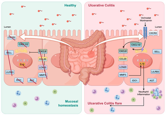 To investigate the microscopic characteristics of pathological tissues in the context of UC, this study elucidated the alterations in gene expression profiles within patients’ colonic tissues at the molecular level. Furthermore, key differential genes and signaling pathways associated with UC were identified and analyzed using bioinformatics approaches, leveraging data from public databases. Through a comprehensive multi-database analysis of genes exhibiting differential expression between healthy and diseased individuals, alongside the enrichment of associated signaling pathways and biological functions, this study aims to elucidate the underlying mechanisms of UC from a holistic perspective. The findings from this study are anticipated to guide the design of subsequent targeted experiments. In this research, transcription gene chip datasets GSE47908 and GSE55306, encompassing colon mucosa tissue from both healthy individuals and patients with ulcerative colitis (UC), were collected for bioinformatics analysis. A total of 102 intersecting differential genes, including 12 pivotal genes (CXCL8, IL1β, CXCL1, CCL20, CXCL2, CXCR2, LCN2, SELL, AGT, LILRB2, MMP3, IDO1), were identified through a combined analysis using GEO2R and Weighted Gene Co-Expression Network Analysis (WGCNA). GO-BP annotation showed that these differential genes were mainly enriched in the inflammatory reaction, leukocyte activation, neutrophil migration, and positive regulation of immune effects. Specifically, CXCL8, CXCL1, and CXCL2, collectively referred to as neutrophil factors, are members of the CXC chemokine family [30]. These chemokines interact with the CXCR2 receptor to facilitate the activation of neutrophils, promoting their migration and adhesion to sites of inflammation [31]. CCL20 is involved in the recruitment of T cells and dendritic cells, thereby enhancing immune responses [32]. Additionally, LCN2 encodes neutrophil gelatinase-associated lipocalin, a critical component of innate immunity and a recognized marker of intestinal inflammation [33]. Furthermore, MMP3 is involved in the degradation of the extracellular matrix during both physiological and pathological processes [34]. Cell surface adhesion molecules encoded by the SELL gene facilitate leukocyte migration to secondary lymphoid organs and sites of inflammation [35]. Additionally, a heme enzyme encoded by the IDO1 gene modulates T cell behavior through the regulation of tryptophan catabolism [36]. AGT is associated with inflammation through the renin–angiotensin system [37]. LILRB3 modifies immune cell signaling, potentially influencing immune dysregulation [38]. Collectively, these processes result in immune cell infiltration, mucosal inflammation, and colonic tissue damage, which are characteristic of ulcerative colitis (UC). The illustration depicts the impact of these genes’ expression on immune cell infiltration in the colonic mucosa, as well as the therapeutic activity of the most promising drug candidates (Figure 9).