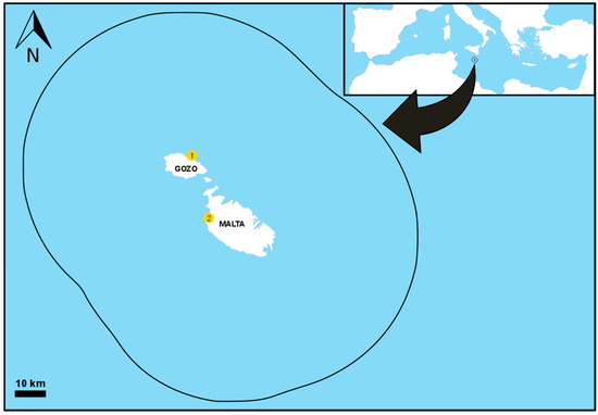 Map showing the Maltese Fisheries Management Zone (circle), where sampling of strandings and in-water sampling was conducted, including the location of the analysed nesting sites: 1—Ramla Bay, Gozo; 2—Ġnejna Bay, Malta.