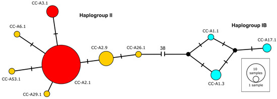 Haplotype network for the mtDNA control region sequences analysed from 63 specimens from Maltese waters. Circle sizes are proportional to sample frequencies. Circles: black indicates undetected haplotypes; yellow indicates haplotypes exclusive to the Mediterranean Sea; blue indicates haplotypes exclusive to the Atlantic Ocean; red indicates haplotypes of mixed origin. Haplogroup II (left) and Haplogroup IB (right) are labelled according to Shamblin et al. [49].