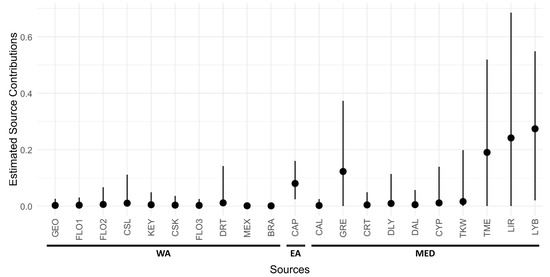The mixed stock analysis indicated that 87.5% were of Mediterranean origin, with the remaining 12.5% of Atlantic origin (4.5% from the western Atlantic and 8.0% from Cape Verde) (Figure 3). Among the Mediterranean contributions, the highest percentage was from Libya (LYB: 27.4%), with other high contributions from eastern Mediterranean coasts, including Turkey (TME: 19.0%), Lebanon, Israel (LIR: 24.1%) and Greece (GRE: 12.3%). Contributions from other Mediterranean regions were lower than 2% (Figure 3). The contributions of all rookeries, except for those of Libya and Cape Verde, have confidence intervals that overlap with zero, an observation noted in other similar studies using the same marker [23,38,51,61]. Therefore, although widely used, results are often limited in precision due to low resolution and the widespread presence of haplotypes CC-A2.1 and CC-A3.1 across rookeries. Despite these limitations, the mtDNA control region remains the main marker for linking foraging populations to nesting sites. The adoption of more sensitive markers to global rookeries, such as complete mitogenomes and genomic studies [33,60], may improve the accuracy of mixed stock analyses in the future.