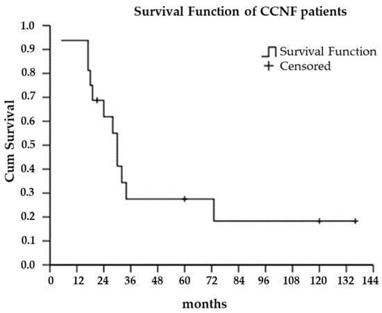 The clinical characteristics of our patients carrying CCNF variants are shown in Table 1. Clinical presentation was heterogeneous, with eight patients presenting with a classic phenotype, four patients showing the UMN-D phenotype, and four patients with flail arm. The majority of patients had a spinal onset (68.7%, five upper limb and six lower limb), while the remaining five patients (31.3%) had a bulbar onset. The male/female ratio was 13/3. The mean age at onset was 66 ± 9.7 (range 48–76) years, and the median survival time was 30 months (Figure 1).