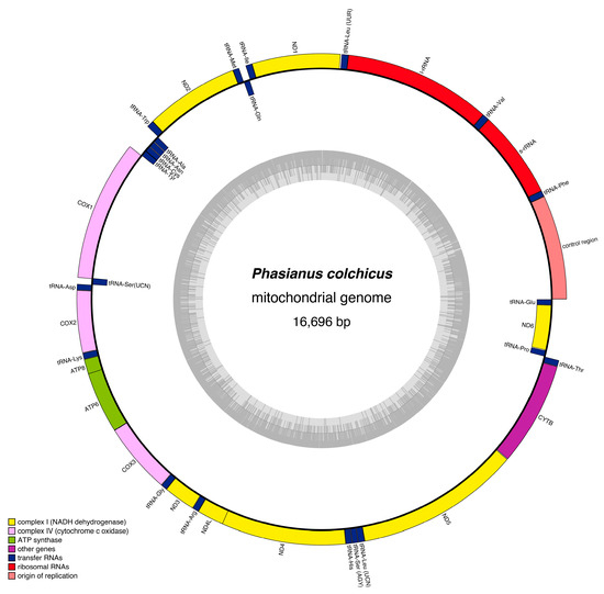 Of late, mitochondrial genomes have increasingly been employed to resolve complex phylogenetic relationships [9,10,11,12]. In general, mtDNA accumulates mutations at a relatively faster rate than nuclear DNA, thus making it particularly useful for revealing closely spaced branching events. Considering that previous phylogenetic studies based on a single gene or a few genes failed to resolve the internal branching orders within the Phasianidae birds, we sequenced the complete mitochondrial genome of P. colchicus, further analyzed its structure, and then compared it with P. versicolor. Additionally, we obtained other mitogenomes from GenBank. Consequently, we used extensive mitogenome data from major groups of Phasianidae birds to infer their phylogenetic relationships.