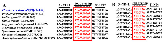 Sequence alignments reveal the conservation of motifs in the ATP8/ATP6 and ND4L/ND4 regions of Phasianidae avian species. (A): ATP8 and ATP6 overlap region; (B): ND4L and ND4 overlap region. The highlighted nucleotides delineate the highly conserved 10 bp (ATGAACCTAA) and 7 bp (ATGCTAA) overlaps among these avian species. The “*” symbol represents the conservative sites.