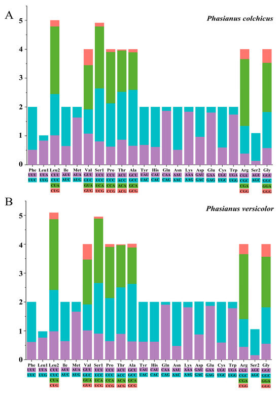 The codon analysis of the 13 protein-coding genes (PCGs) in P. colchicus and P. versicolor revealed a total of 3796 codons, with the absence of the AGA termination codon. Among these, the codons CUA, AUC, and UUC were the most frequently utilized, occurring 259, 204, and 167 times in P. colchicus and 270, 207, and 157 times in P. versicolor, respectively. This pattern underscores the codon usage bias in the mitogenomes of the two Phasianus species. In terms of the amino acid composition encoded by the 13 protein-coding genes (PCGs), P. versicolor uniquely encoded an additional Leu, Ile, Pro, Ala, His, Lys, Glu, Arg, Gly, and Ser compared to P. colchicus. Conversely, P. colchicus had a higher count of valine (Val), proline (Pro), threonine (Thr), lysine (Lys), arginine (Arg), and glycine (Gly) than P. versicolor. This comparative analysis highlights the subtle differences in the genetic encoding of amino acids between the two species (Figure S1).