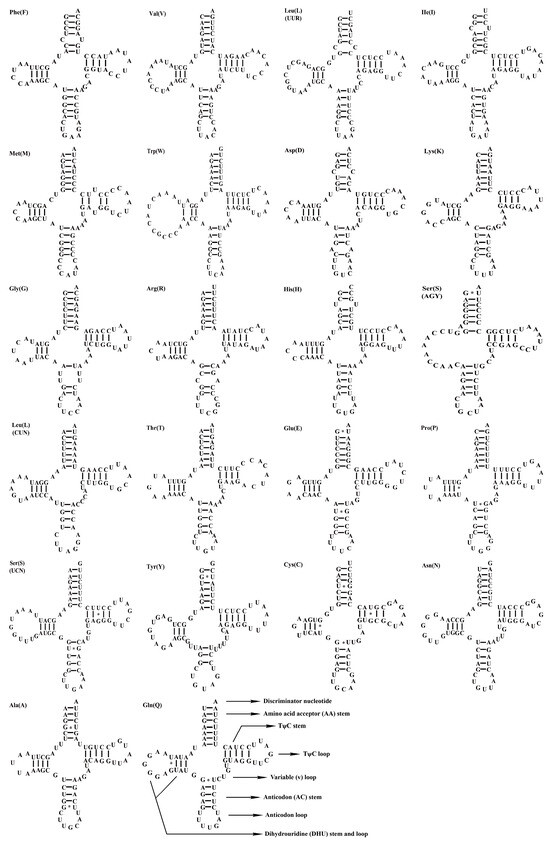 - Chan, P.P.; Lin, B.Y.; Mak, A.J.; Lowe, T.M. tRNAscan-SE 2.0: Improved Detection and Functional Classification of Transfer RNA Genes. Nucleic Acids Res. 2021, 49, 9077–9096. [Google Scholar] [CrossRef]