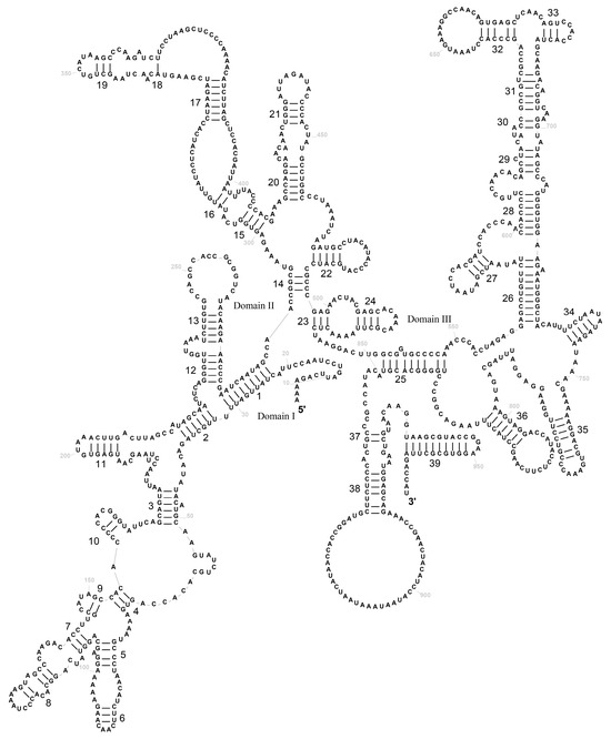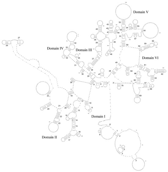 In the mitochondrial genomes of P. colchicus and P. versicolor, two types of rRNA are present: 12S rRNA and 16S rRNA. The 12S rRNA is situated between the tRNA-Phe and tRNA-Val genes, and both species share a 12S rRNA sequence length of 966 base pairs, with a divergence of 11 base pairs. The 16S rRNA, positioned between tRNA-Val and tRNA-Leu (UUR), exhibits a length of 1626 base pairs in P. colchicus and 1620 base pairs in P. versicolor, with a total of 26 base pair differences. The predicted secondary structures of the 12S and 16S rRNAs are composed of three domains with 39 stem–loop structures and six domains with 70 stem–loop structures, respectively (Figure 5 and Figure 6).