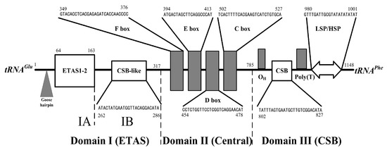 The mitochondrial control region, delineated by the variable nucleotide positions and their differential frequencies, is segmented into three distinct domains as illustrated in Figure 7. In the case of P. colchicus, the control region’s nucleotide composition is characterized by 27.44% adenine (A), 32.49% thymine (T), 25.87% cytosine (C), and 14.20% guanine (G). This composition reveals a notable underrepresentation of guanine, a trait commonly observed in the sense strand of vertebrate mitochondrial DNA [33]. Domain I, known as extended termination-associated sequences (ETAS), comprises two segments, Part A and Part B. Part A contains a highly conserved block (5′-TACCCCCCCTTTCCCCCCCAGGGGGGGTA-3′), which shares sequence homology with the “goose hairpin” as reported in Anas caerulescens by Quinn [34]. Within Part A, ETAS1 and ETAS2 are located at positions 64–126 and 124–163 bp, respectively, with an overlap of 3 bp and sequence similarities of 70.3% and 45.6% to the consensus mammalian ETAS1 and ETAS2 [15]. In Part B (nt 163–317), a CSB1-like block (5′-ATACTATGAATGGTTACAGGACATA-3′) is present, exhibiting a 69.2% similarity to CSB1 in domain III. The central domain II (nt 318–785) features four conserved sequence boxes labeled C, D, E, and F. Domain III (nt 786–1148) contains a poly(C) sequence (nt 778–791), analogous to the origin of H-strand replication (OH) in mammals, which is situated just downstream of the proposed CSB1 (nt 802–827). Notably, the CSB domain of P. colchicus lacks distinct traces of CSB2 and CSB3. Additionally, the bidirectional light- and heavy-strand transcription promoters (LSP/HSP) are identified in P. colchicus (Figure 7).