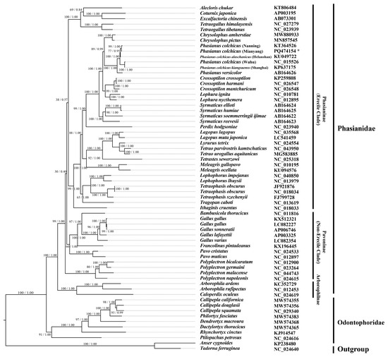Phylogenetic datasets with 12 PCGs (ATP6, ATP8, CO I, CO II, CO III, ND1, ND2, ND3, ND4, ND4L, ND5, and ND6), except for CYTB (b) from 64 sequences were analyzed, including 38 Phasianinae, 3 Arborophilinae, 13 Pavoninae, 8 Odontophoridae, and 2 outgroup species (Anser cygnoides and Tadorna ferruginea). The accession numbers of the sequences are listed in Table S2. The amino acid sequences of the 12 PCGs were aligned using MAFFT in PhyloSuite v.1.2.3 with default parameters [21,22]. The Gblocks program in PhyloSuite (version 1.2.3) was used to clear the ambiguously aligned fragments of the 12 PCGs sequences. Phylogenetic trees were constructed based on the alignment dataset using maximum likelihood (ML) and Bayesian inference (BI) methods conducted by MEGA (version 11.0) and the MrBayes (version 3.2.6) plugin integrated into PhyloSuite (version 1.2.3), respectively [19,23]. The ML tree was inferred using the parameters of 1000 bootstrap replications. The best-fitting model of the BI phylogenies was estimated by ModelFinder (http://www.iqtree.org/ModelFinder/, accessed on 5 October 2024) with the params of 5,000,000 generations [24]. The plot of the phylogenies tree was drawn with the tool FigTree (http://tree.bio.ed.ac.uk/software/figtree/, accessed on 5 October 2024).
