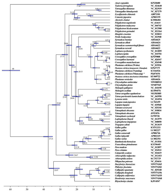 The divergence time of Phasianidae with 95% highest posterior probability density. Numbers nearby nodes refer to divergence times. The “*” represents the current study.