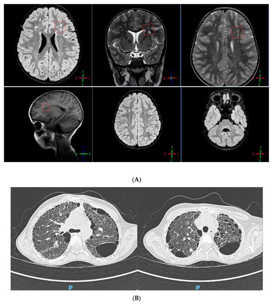 (A) Brain MRI showing leukoencephalopathy. (B) Thoracic CT scan showing “ground glass” and “honeycomb” patterns.