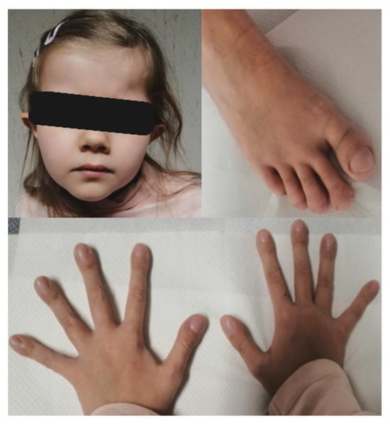 Recent auxological parameters confirm the patient’s poor growth status: weight 16 kg (below 3rd centile, −3.79 SD), height 114.8 cm (below 3rd centile, −4.07 SD), CC 49.7 cm (below 3rd centile, −2.37 SD). We also report her dysmorphic features: elfin-like face, prominent forehead with frontal bossing, deeply set eyes, protruding ears with attached lobes, pectus carinatum, abnormal subcutaneous fat deposition at hips, arachnodactyly with digital clubbing (Figure 2).