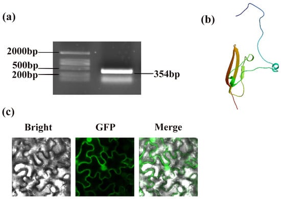 The genetic sequence of PpSnRK1β3 (Prupe.6G107300) was retrieved from the NCBI database (https://www.ncbi.nlm.nih.gov/gene/18773156, accessed on 16 May 2024). The encoded protein has a coding sequence length of 354 base pairs, as observed in the electropherogram of the gene ligation vector (Figure 1a). PpSnRK1β3 is structurally comprised of three helices, three strands, and seven coils, indicating a complex and intricate composition (Figure 1b). In addition, a subcellular localization fluorescence analysis demonstrated that it is present in both the nucleus and cell membrane (Figure 1c).