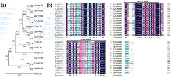 Phylogenetic tree analysis of PpSnRK1β3. (a) Phylogenetic tree analysis of the SnRK1β3 protein in different species. (b) Sequence alignment of the SnRK1β3 protein from different species.