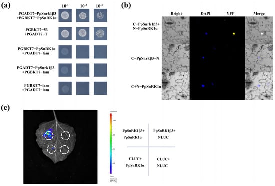 Interaction between the PpSnRK1β3 and PpSnRK1α subunits. (a) Yeast two-hybrid assay of PpSnRK1β3 and PpSnRK1α. (b) Bimolecular fluorescence complementation (BiFC) assay of PpSnRK1β3 and PpSnRK1α. (c) Dual luciferase assay of PpSnRK1β3 and PpSnRK1α.