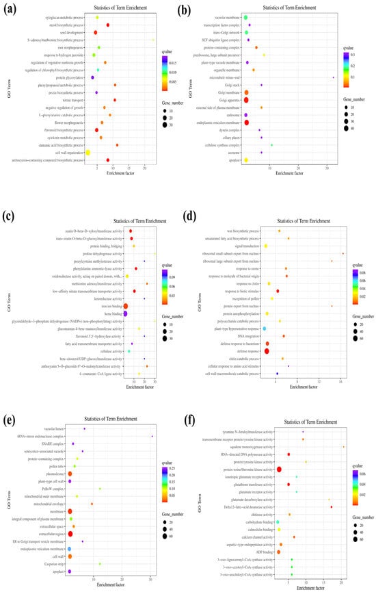 A differential gene expression analysis between WT plants and OEPpSnRK1β3 mutants revealed significant differences in multiple biological processes, cell compositions, and molecular functions. The OEPpSnRK1β3 mutants showed a marked upregulation in sterol biosynthesis, seed development, nitric acid transport, flavonoid biosynthesis, and anthocyanin-containing compounds compared with the WT plants (Figure 4a). In terms of cell composition, the OEPpSnRK1β3 mutants exhibited significant upregulation in the Golgi apparatus and endoplasmic reticulum membranes (Figure 4b). With respect to molecular function, the OEPpSnRK1β3 mutants exhibited higher expression levels of key enzymes such as zeatin xylosyltransferase, trans-corn glucosyltransferase, phenylalanine ammonia-lyase, and low-affinity nitrate transmembrane transporter (Figure 4c). In addition, a comparison between WT and OEPpSnRK1β3 tomato materials showed that WT plants were more sensitive to biostimuli during normal growth states, while WT was more sensitive to pollen recognition, ribosome export from the nucleus, and higher response to ozone than overexpressed materials (Figure 4d). With respect to cell composition, the OEPpSnRK1β3 mutants exhibited downregulation of plasmodesmata, membrane components, and extracellular space (Figure 4e). At the molecular function level, the OEPpSnRK1β3 mutants exhibited reduced activity in RNA-directed DNA polymerases, protein serine/threonine kinases, glutathione transferases, and amino acid kinases (Figure 4f).