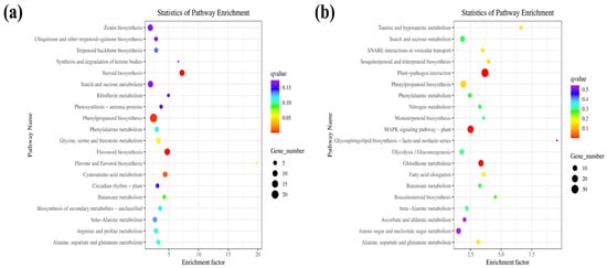 KEGG enrichment was used to identify DEG-related pathways []. This analysis revealed a significant upregulation of various pathways in both the WT and OEPpSnRK1β3 samples. In the OEPpSnRK1β3 mutants, pathways such as steroid biosynthesis, flavonoid biosynthesis, phenylpropanoid biosynthesis, and cyanamide acid metabolism were enriched (Figure 5a). Conversely, the OEPpSnRK1β3 sample exhibited significant downregulation in pathways associated with plant-pathogen interactions, MAPK signaling, glutathione metabolism, as well as several amino acid metabolism pathways (Figure 5b).