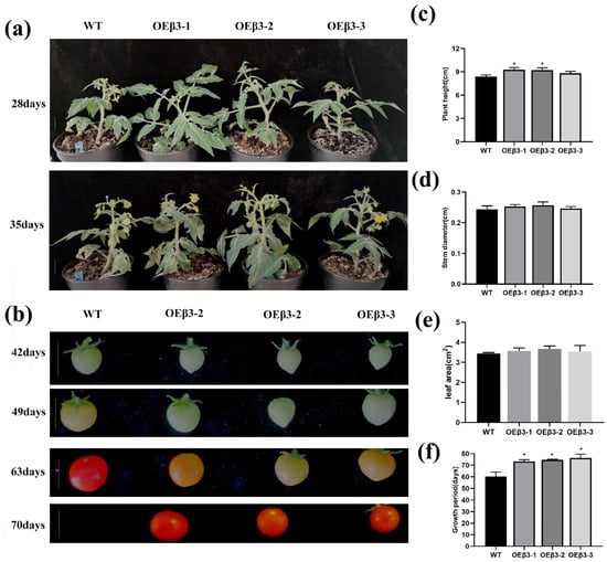 Growth characteristics of the OEPpSnRK1β3 tomatoes. (a) Growth period of OEPpSnRK1β3 and WT tomatoes (white line in the diagram indicates the height of 1 cm). (b) Fruit development period of OEPpSnRK1β3 and WT tomatoes (white line in the diagram indicates the length of 1 cm). Comparison of plant height (c), stem diameter (d), leaf area (e), and number of days in the growth period (f) for three strains of OEPpSnRK1β3 and WT tomatoes. Error bars represent the means ± SD (n = 3) from three independent biological replicates. Note: For (c–f), asterisks represent significant differences (LSD test, *, p < 0.05).