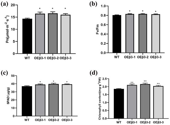 The net photosynthetic rate (Pn) and chlorophyll fluorescence parameters (Fv/Fm) ratio of plants are important factors for establishing their photosynthetic capabilities. Higher Pn and Fv/Fm values indicate stronger photosynthetic capacity [,]. The SPAD value, which reflects the relative chlorophyll content in leaves, plays a key role in assessing photosynthetic efficiency []. OEPpSnRK1β3 tomatoes exhibited a significant increase in net photosynthetic efficiency and Fv/Fm compared with WT tomatoes (Figure 7a,b). In addition, the SPAD value and chlorophyll content of overexpressed tomatoes were higher than the WT tomatoes, which indicates that OEPpSnRK1β3 tomatoes enhance chlorophyll accumulation and improve photosynthetic activity (Figure 7c,d). Based on these findings, it is evident that PpSnRK1β3 overexpression in tomatoes positively influences photosynthetic activity.