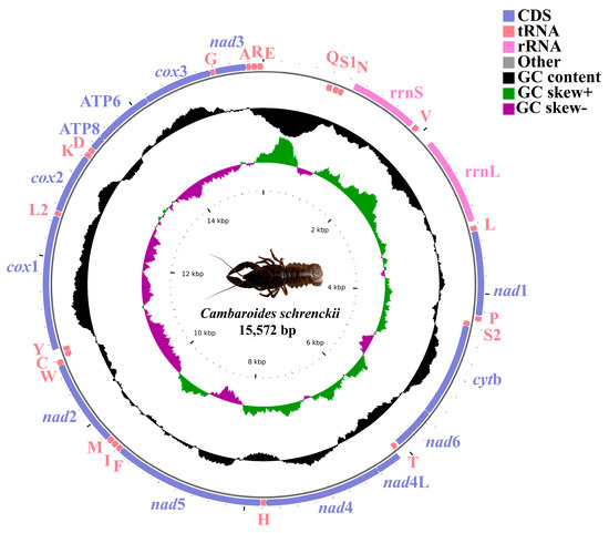 The cox1 sequencing of C. schrenckii from Heilongjiang province showed 100% nucleotide identity when compared to C. schrenckii from Russia (GenBank accession No. KX268737). Therefore, the species obtained in this study was identified as C. schrenckii. The C. schrenckii (GenBank accession No. PP497825) mitochondrial genome was 15,572 bp in length, which is below average compared to other species in the infraorder Astacidea (Figure 1). The C. schrenckii complete mitochondrial genome had typical circular molecules featuring 13 PCGs, 2 rRNAs (12S rRNA and 16S rRNA), 22 tRNAs, and a d-loop (764 bp) located between trnE and trnQ. Nine genes (nad2, cytb, trnQ, trnS1, trnN, trnS2, trnT, trnC, and trnY) were encoded on the negative strand, with twenty-eight genes encoded on the positive strand (Table 1). The C. schrenckii genome nucleotide composition was biassed towards A + T, with A + T bases comprising 67.18% of PCGs, 72.66% of rrnL, 74.68% of rrnS, and 73.75% of tRNAs, with the overall genome A + T content being 69.61% (Figure 2). The A + T content of the d-loop was 84.53%, and the C + G content was 15.47%.