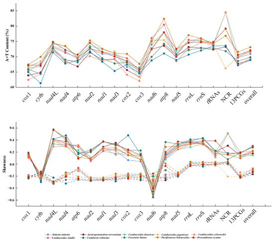 Besides the mitochondrial genome sequence of C. schrenckii, the mitochondrial genomes of 42 species (22 Astacoidea species, 2 Enoplometopoidea species, 4 Nephropoidea species, and 14 Parastacoidea species) were obtained from GenBank (Table S1). The nucleotide compositions of ten crustaceans belonging to seven genera of the same superfamily were analysed using Editseq software. Composition skews were calculated according to the formulae AT-skew = [A − T]/[A + T] and GC-skew = [G − C]/[G + C] [28].