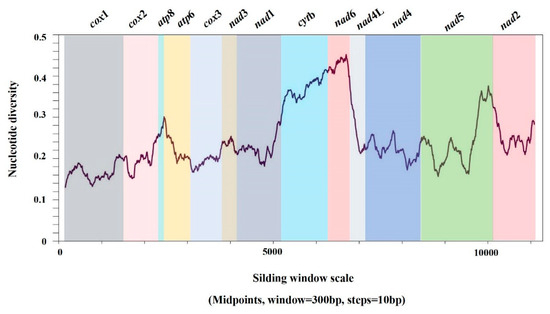 Sliding window analysis of the complete mitochondrial genome sequences of five Astacoidea. A sliding window of 300 bp (in 10 bp overlapping steps) was used to estimate nucleotide diversity Pi (π) across the alignments. Nucleotide diversity was plotted against the mid-point positions of each window. Each gene boundary is identified.
