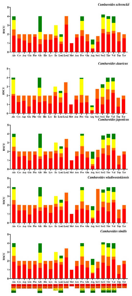 Relative synonymous codon usage (RSCU) of 13 protein coding genes of C. schrenckii, C. dauricus, C. japonicus, Cambaroides wladiwostokiensis, and C. similis. The termination codon is not given.