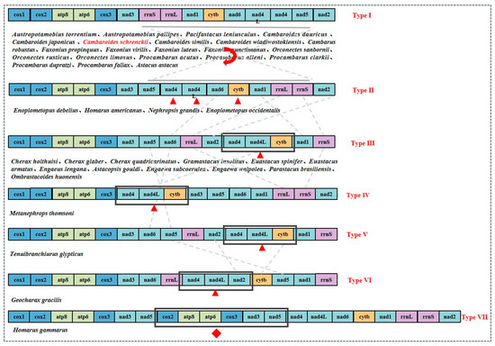The gene arrangement indicated that forty-three Astacidea species belonged to four superfamilies, which were divided into seven types in the present study. This study found type I to be the most common arrangement observed in most species of crayfish including C. schrenckii, which is consistent with the majority of pan-crustacean arrangements when inversion was disregarded [44]. Some aquatic organisms have been shown to have a faster evolutionary rate in their mitochondrial genomes than terrestrial organisms. Some crustacean species in particular may display elevated rates of mitochondrial genome evolution due to their specific ecological habits [45,46,47]. Recent studies have shown that gene cluster duplication is not only evidence of accelerated evolution, but also a key factor in enhancing biological diversity and complexity [48]. In a mitochondrial genome-wide analysis of decapod crustaceans, Hong et al. identified a deletion of the gene nad2 in the Homarus gammarus specimen belonging to the family Nephropidae [49]. However, to create a whole mitochondrial genome assembly for H. gammarus, Han et al. re-sequenced the genome on an Oxford Nanopore Minion flowcell and carried out a long-read-only assembly [50]. The absence of nad2 was detected, and a gene cluster duplication was found in H. gammarus. Accordingly, we analysed the mitochondrial genome sequences of H. gammarus utilising resequenced H. gammarus mitochondrial genome sequences, which have been attributed to type VII. Although gene cluster duplication was only present in type VII, complex gene remakes also occurred in other rows, possibly due to the various evolutionary speeds in different species in specific environments. In total, complex types of gene rearrangements can be observed in the infraorder Astacidea.