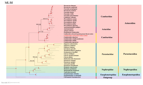 Phylogenetic relationships of C. schrenckii with other 42 representative Astacidea based on concatenated amino acid sequences of 13 protein coding genes analysed by maximum likelihood (ML) and Bayesian inference (BI) using C. haematocheir as the outgroup. Red dots on nodes indicate BPP = 100/1.00.