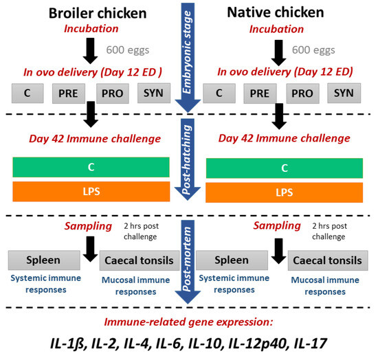 Trials were conducted on two chicken genotypes (broiler and native chicken). Each trial was based on the same full-factorial design, in which the experimental factors were as follows: (1) in ovo stimulation (with prebiotic, probiotic, or symbiotic vs. physiological saline), and (2) immune challenge with LPS vs. physiological saline. Figure 3 presents the experimental design described in this study. The treatments were followed by harvesting the CT and spleen to study local and systemic immune-related gene expression.
