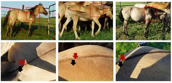 Sample collection from dun Mongolian Bider horses. Left–Right: Yellow dun, Red dun, Blue dun (Grullo). The corresponding Bider markings on the shoulder blade are indicated within the red boxes, the red arrows show the dorsal midline, and the black arrows show the croup skin.