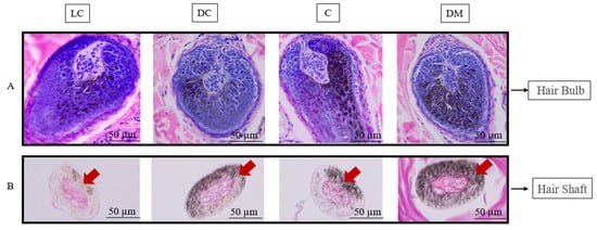 HE staining of follicle morphology and pigmentation in different parts of the dun Mongolian Bider horse. Note: LC shows the light-colored Bider markings on the shoulder; DC shows the dark-colored Bider markings on the shoulder; C shows the croup skin; and DM shows the dorsal midline. (A) shows the pigmentation distribution the hair bulb; (B) shows the pigmentation distribution in the hair shaft. Red arrow shows the location of pigment deposition. The scale used in the illustrations is 50 µm.