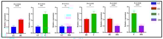 Relative expression of the TBX3 gene in skin tissues of three different sampling sites. Note: LC shows the light-colored Bider markings on the shoulder; DC shows the dark-colored Bider markings on the shoulder; C shows the croup skin; and DM shows the dorsal midline. The error bars represent the standard error of the mean (SEM). The significance levels were set as follows: a p-value < 0.05 (*) indicates a significant difference, p-value < 0.01(**/***) indicates a highly significant difference, and p-value > 0.05 (ns) indicates no significant difference.