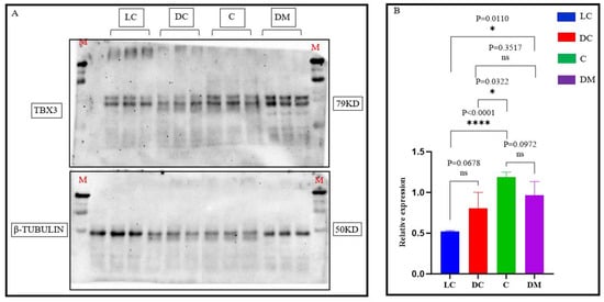 Relative expression of TBX3 protein in skin tissues from three different sites. Note: M indicates the marker; LC shows the light-colored Bider markings on the shoulder; DC shows the dark-colored Bider markings on the shoulder; C shows the croup skin; and DM shows the dorsal midline. (A) presents the WB (Western blot) image; (B) is a bar graph depicting the relative expression levels of TBX3 protein in skin tissues from the three different regions, with different colors representing different locations. The error bars indicate the standard error of the mean (SEM). The significance levels were set as follows: a p-value < 0.05 (*) indicates a significant difference, p-value < 0.01(****) indicates a highly significant difference, and p-value > 0.05 (ns) indicates no significant difference.