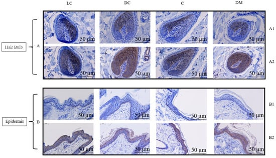 Immunohistochemical staining of different sampling locations of the dun Mongolian Bider horses. Note: (A). Localization of TBX3 protein in the hair bulb (A1 with primary antibody, A2 without primary antibody); (B). Localization of TBX3 protein in the epidermis (B1 with primary antibody, B2 without primary antibody). LC shows the light-colored Bider markings on the shoulder; DC shows the dark-colored Bider markings on the shoulder; C shows the croup skin; and DM shows the dorsal midline. The scale used in the illustrations is 50 µm.