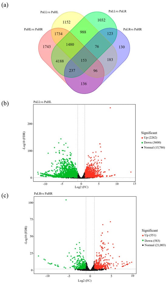 Differentially expressed genes (DEGs) of leaf and root in avocado under different N supply conditions. (a) The display of DEGs in PaLL, PaLR, PaHL, and PaHR. (b) The up-regulated and downregulated DEGs in PaLL vs. PaHL group. (c) The up-regulated and downregulated DEGs in PaLR vs. PaHR group.