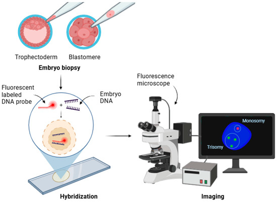 The first generation of PGT was based on fluorescence in situ hybridization (FISH), which was introduced in 1993 using blastomere biopsy [9]. This method uses specific DNA probes labeled with different fluorochromes, which, once hybridized with the sample, enable the observation of results through fluorescence microscopy [10] (Figure 2). In a FISH protocol, the analysis is limited to a range of 5 to 12 probes during 2–3 cycles of hybridization, which primarily focuses on identifying the most common aneuploidies, such as those involving chromosomes 13, 15, 16, 18, 21, 22, and the sex chromosomes [11], which are frequently associated with spontaneous miscarriage, leaving a significant number of anomalies in other parts of the genome undetected. The accuracy of this technique is affected by the overlap, splitting, and diffusion of signals, as well as by probe inefficiency [12,13,14].