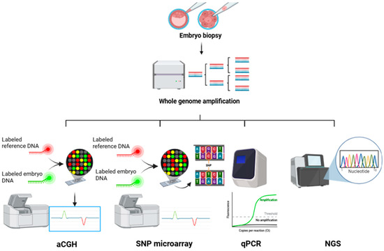 Since the amount of DNA in biopsied cells is limited, a key development was whole genome amplification (WGA) [17]. WGA is an established technique to amplify the entire genome from a single cell, generating sufficient DNA for detailed analysis of the 24 chromosomes [18]. Once DNA is amplified, it can be analyzed using various techniques such as comparative genomic hybridization arrays (aCGH), single nucleotide polymorphism (SNP) arrays, or next-generation sequencing (NGS) [12] (Figure 3).