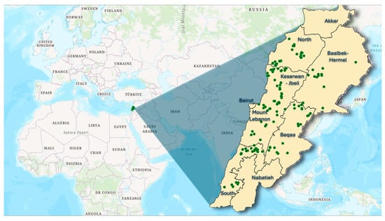 Figure 1. Geographic distribution of sampling sites in Lebanon represented by green dots.