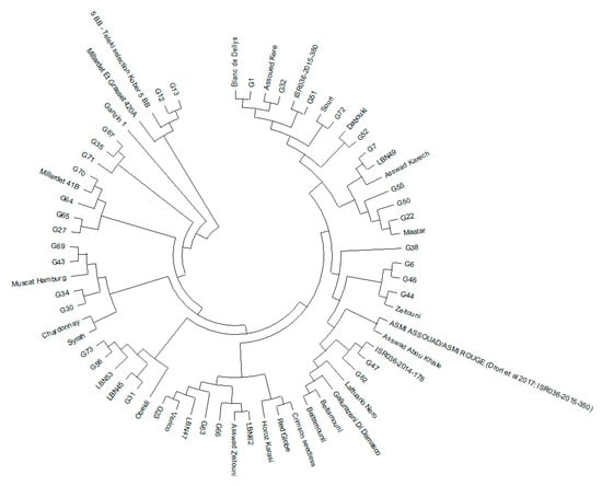 59. Ziane, L.; Bentchikou, M.; Bravo, G.; Cabello, F.; Martínez-Zapater, J. Molecular Identification and Genetic Relationships of Algerian Grapevine Cultivars Maintained at the Germplasm Collection of Skikda (Algeria). Vitis Geilweilerhof 2009, 1, 25–32. [Google Scholar]