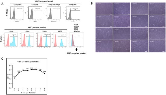 TMSCs were harvested at a concentration of 0.5–1 × 106 cells and washed with PBS. Cells were then stained with surface monoclonal antibodies using 100 µL of FACS buffer (Biolegend, San Diego, CA, USA). Then cells were mixed with Stemflow™ human MSC Analysis Kit (BD Biosciences, San Jose, CA, USA) according to the manufacturer’s instructions. The following antibodies were utilized in this study: CD44 PE, CD73 APC, CD90 FITC, CD105 PerCP-Cy5.5, and CD11b/CD19/CD34/CD45/HLA-DR PE. The cell suspension with each antibody was incubated for 30 min at 4 °C in the dark. Following two washes, cells were resuspended in 500 µL of FACS buffer for acquisition on a FACS Canto II System (BD Biosciences, Franklin Lakes, NJ, USA). A total of 10,000 cells were counted, and unstained TMSCs and isotype controls were used as negative controls for each wavelength. Data were analyzed using Cell Quest ProTM, FACS DivaTM version 7.0, and Flowjo version 10.10 (BD Biosciences, Franklin Lakes, NJ, USA). Results were presented as the percentage of labeled cells and fluorescence intensity for each individual monoclonal antibody.