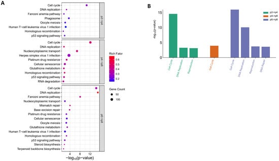 Results of KEGG and Reactome pathway analysis for the DEGs are shown in Figure 2. Of DEGsp2p4, most of the significantly enriched terms of the KEGG pathway were related to cellular processes (cell cycle, phagosome, oocyte meiosis, and p53 signaling pathway) or genetic information processing (DNA replication, Fanconi anemia pathway, and homologous recombination). Genes involved in cellular processes and genetic information processing are pivotal for the proliferation of all cells, including stem cells. DEGsp4p6 and DEGsp6p8 were also enriched in similar terms of the KEGG pathway to DEGsp2p4. Results of Reactome pathway analysis were similar to those of the KEGG pathway (Figure 2B). Cell cycle is consistently enriched at all DEGs. DEGsp6p8 were also enriched in DNA repair in the Reactome pathway and mismatch repair and base excision repair in the KEGG pathway.