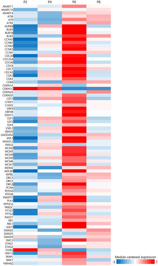 There have been studies observing transcriptomic or proteomic changes during the serial subculture process of MSCs. When BMSCs were continuously cultured, the expression of genes related to cell cycle, DNA replication, and DNA repair was decreased in late passage (passage 7–11) compared to early passage (passage 2) in all three donors [16]. Another paper comparing the characteristics of passage 4 and passage 10 umbilical cord-derived MSCs also reported changes in the amounts of proteins related to the cell cycle and p53 pathway [17]. In another paper comparing transcriptome differences between control (passage 5–8) and aged (passage 20–25) TMSCs, changes in the expression of genes involved in cell cycle, DNA replication, base excision repair, and the p53 pathway were observed [18]. Although direct comparison is difficult because the sources of MSCs used in these studies and the passages compared were different, it was commonly confirmed that the expression of genes related to the cell cycle, DNA repair, and p53 pathway mainly changed during the serial subculture process of MSCs.