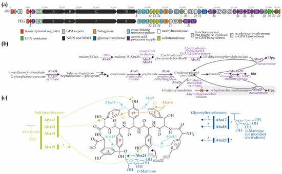 Organization of the aba BGC from A. bartoniae DSM 45807 and prediction of the encoded biosynthetic pathway: (a) genetic organization of the aba BGC comparing to that of the TEG BGC, obtained from the uncultured soil bacterium clone D30 (BGCs are drawn to approximate scale, color-coding is explained in the legend); (b) reconstructed biosynthetic pathways for 4-hydroxyphenylglycine (Hpg), 3,5-dihydroxyphenylglycine (Dpg), and β-hydroxytyrosine (Bht) encoded within aba (the Hpg biosynthesis pathway lacks 4-hydroxymandelate oxidase, as the corresponding gene is absent in aba); (c) putative structure of A. bartoniae GPA inferred from in silico analysis (the substrate and/or donor specificity of some tailoring enzymes remains unknown).